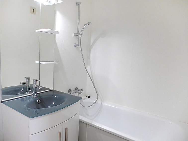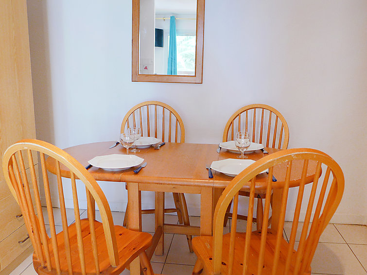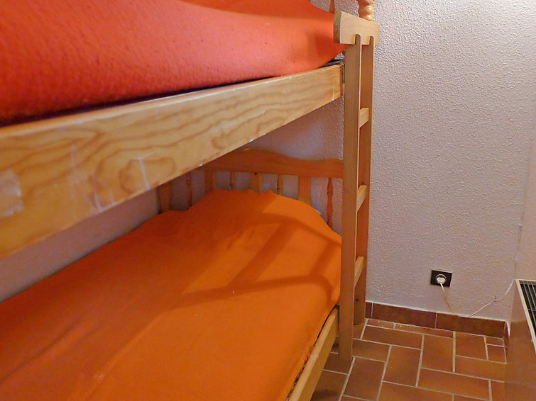 Appartement 2-kamers 30 m2, op verhoogde begane grond, op het zuidoosten gelegen. Eenvoudig ingericht: woon-/eetkamer met panoramavenster met TV en ventilator. Uitgang naar het terras. 1 kamer met 1 2-pers bed (1 x 140 cm, lengte 190 cm), ventilator. Cabine met 1 x 2 stapelbedden (90 cm, lengte 190 cm). Kookhoek (mini-oven, 3 keramische glas kookplaten, broodrooster, waterkoker, elektrische koffiemachine). Uitgang naar het terras. Badkamer, aparte WC. Verwarming. Terras 5 m2, overdekt, op het zuiden gelegen. Terrasmeubelen. Ter beschikking: strijkijzer, haardroger. Internet (Internet (WiFi), extra). Parkeerplaats nr. 379. TV alleen FR. Rookmelders. In plaats van een afgesloten slaapkamer bevinden sommige slaapgedeeltes zich in een open ruimte (galerij, nis, etc.). 831070002237H