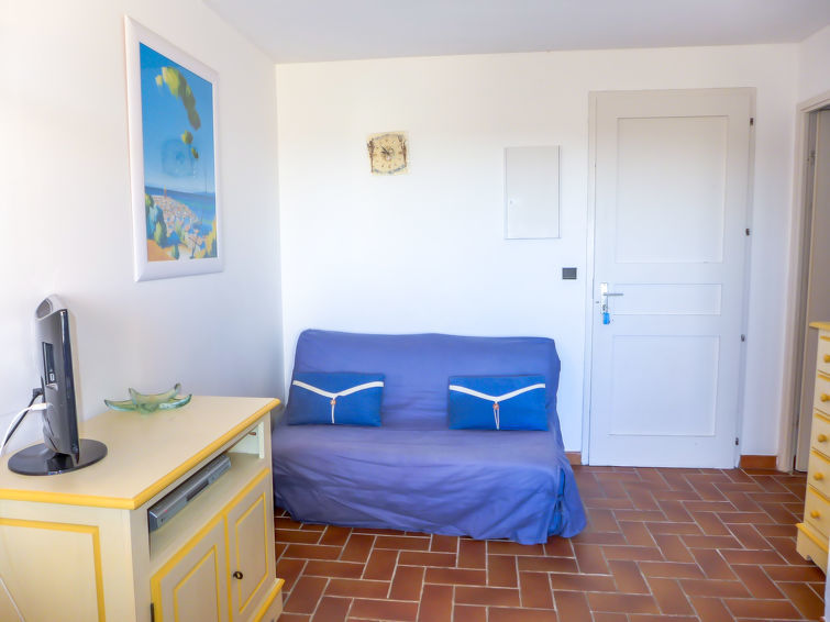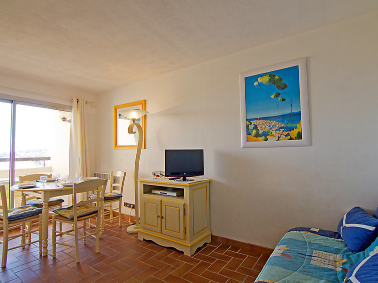 Appartement 2-kamers 40 m2 op de 1e verdieping. Eenvoudig ingericht: woonkamer met panoramavenster met TV (Flatscreen TV), DVD en ventilator. Uitgang naar het terras. Cabine, zonder kast met 1 x 2 stapelbedden (80 cm, lengte 190 cm), ventilator. 1 kamer met 1 2-pers bed (1 x 140 cm, lengte 190 cm), ventilator. Kookhoek (2 inductiekookplaten, broodrooster, waterkoker, magnetron, elektrische koffiemachine). Douche, aparte WC. Elektrische verwarming. Terras 5 m2, overdekt. Terrasmeubelen, ligstoelen (2). Beperkt uitzicht op zee. Ter beschikking: wasmachine, strijkijzer, haardroger. Internet (Internet (WiFi), extra). Parkeerplaats nr. A151/472. 1 klein huisdier/hond toegestaan. TV alleen FR. Rookmelders. In plaats van een afgesloten slaapkamer bevinden sommige slaapgedeeltes zich in een open ruimte (galerij, nis, etc.). 83107000216J5
