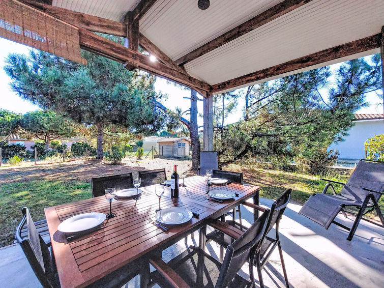 Eengezinswoning. In de wijk Le Hameau des Pins, 1 km van het centrum van Montalivet, 7.5 km van het centrum van Vendays, 19 km van het centrum van Soulac-sur-Mer, in een woonwijk, 1.4 km van zee, 1.4 km van het strand, aan een doodlopende weg. Voor alleengebruik: wild terrein 800 m2 (omheind), parkeerplaats bij het huis op het terrein. Winkel 1 km, supermarkt 1.2 km, bushalte "Av. De l'Europe/Montalivet" 650 m, zandstrand "Montalivet" 1.4 km, meer (zwemmen) "Hourtin" 30 km. Attracties in de buurt: Lacanau 50 km, Bordeaux 80 km.