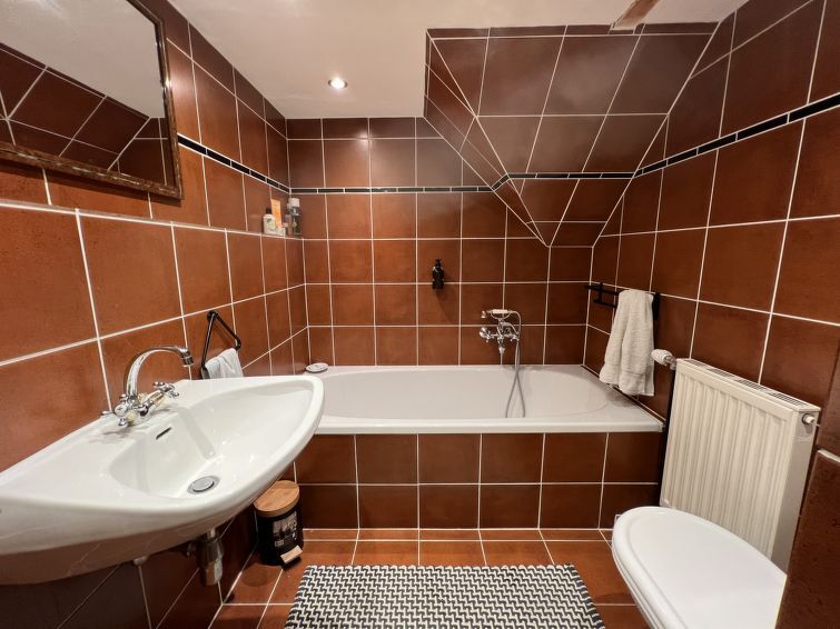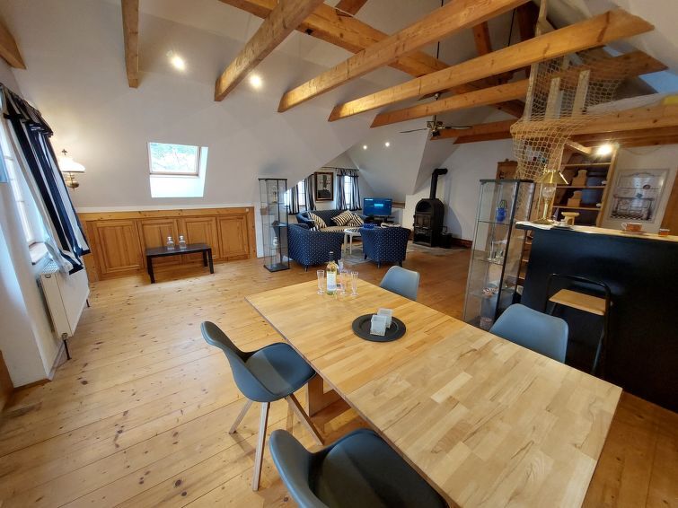 Loft, 1-kamer 70 m2, op de bovenverdieping. Het objekt is geschikt voor 2 volwassenen. Rustiek en smaakvol ingericht: open woon-/eetkamer met afgeschuinde daken met dakraam met 1 x 1 stapelbedden (180 cm, lengte 200 cm). Met afgeschuinde daken, open keuken (4-pits kookplaat, oven). Bad/WC. Verwarming. Houten vloeren. Uitzicht op de tuin. Niet rokers woning. Privé ingang.