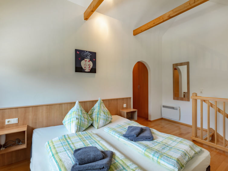 "Top 6", maisonette 3-kamers 65 m2 op 2 verdiepingen, op de bovenverdieping. Gedeeltelijk afgeschuinde daken, comfortabel en gezellig ingericht: hal. Woon-/slaapkamer met 1 2-pers divanbed (160 cm), zwedenkachel, eettafel, Sat-TV, Flatscreen TV en DVD. Uitgang naar het balkon. 1 2-pers. kamer met douche. Open keuken (oven, afwasmachine, 4 keramische glas kookplaten, elektrische koffiemachine). Aparte WC. Zolderverdieping: galerij met 1 2-pers bed en bad/WC. Parketvloeren. Balkon. Balkonmeubilair. Mooi panoramazicht op de skipiste en het landschap. Ter beschikking: wasmachine, droger. Internet (Internet (WiFi), gratis). Garage nr. 6 (1 Auto). Niet rokers woning. Op de slaapgalerij bevindt zich ook nog kastruimte. In plaats van een afgesloten slaapkamer bevinden sommige slaapgedeeltes zich in een open ruimte (galerij, nis, etc.). 50508-002506-2020